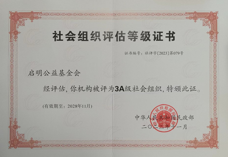 2018年11月,啟明公益基金會被國家民政部評為3A級社會組織。