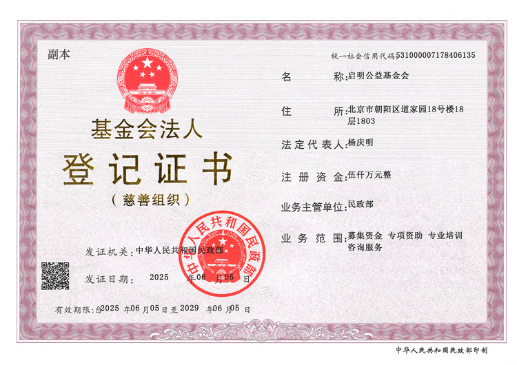2015年1月19日,啟明公益基金會經中華人民共和國民政部批準成立。啟明公益基金會遵守憲法、法律、法規和國家政策,踐行社會主義核心價值觀,堅持中國共產黨的全面領導。啟明公益基金會的成立,標志著啟明公益慈善事業已經步入正規化、專業化、社會化、有序化的軌道,已成為中國公益慈善領域中新的一員。