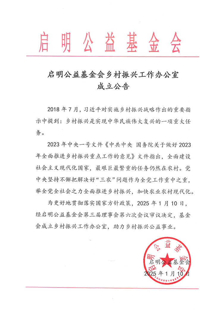 啟明公益基金會鄉村振興工作辦公室成立公告
