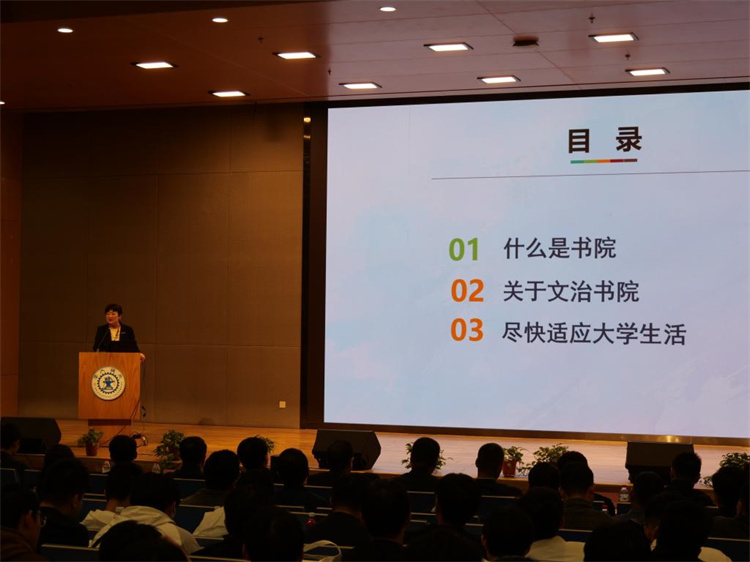 文治書院院務主任王琦介紹了書院發展歷程,從書院的理念、特點、組織架構、模式等方面介紹了書院發揮的功能和作用。她從文治書院的院訓、育人使命、核心價值觀、學風等方面展示了文治書院的育人體系。她希望各位同學要做到心態調整、方法調整、養成主動精神,早日適應大學生活。