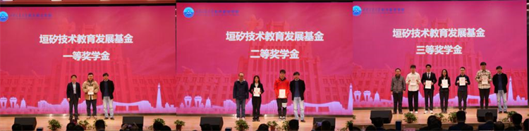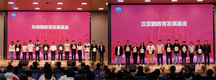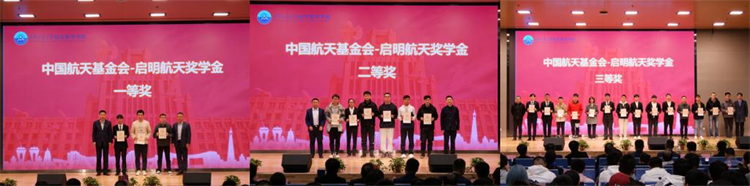 參會領導和嘉賓為“中國航天基金會-啟明航天獎學金、垣矽技術教育發展基金、朱繼梅教育發展基金、沈亞鵬教育發展基金的獲得者頒獎并合影留念。